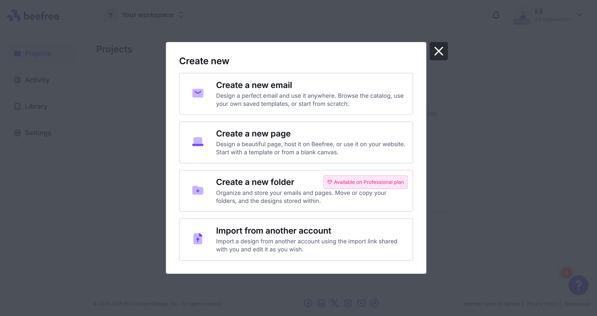 Projekterstellung in BeeFree (Auszug von BeeFree.io)