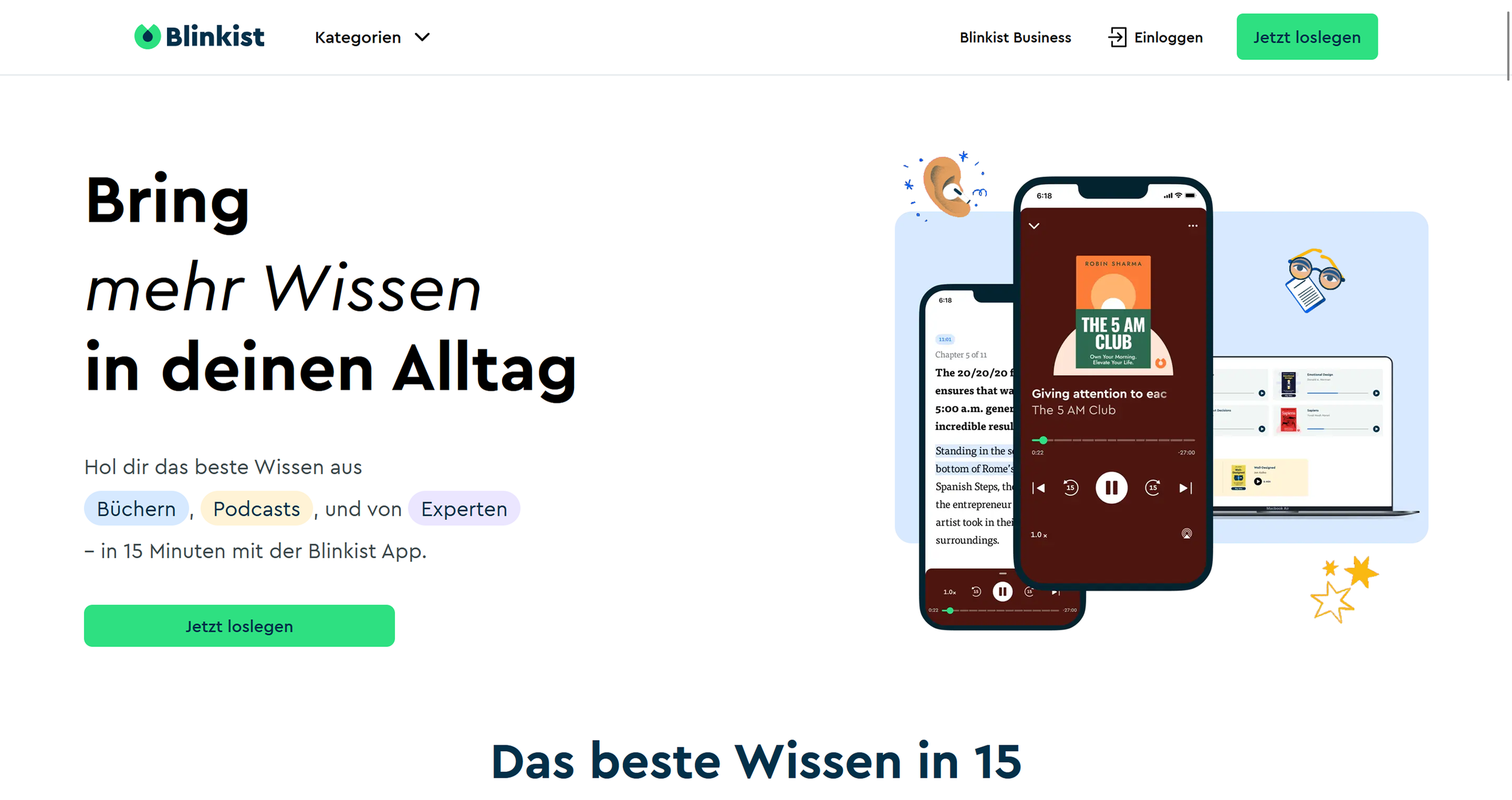 Kontinuierliches Lernen bleibt essenziell, ob für Kundenprojekte oder die eigene Weiterentwicklung. Blinkist fasst dir die Kernaussagen von über 7.500 Sachbüchern in rund 15 Minuten zusammen. Von Business-Strategien bis zu persönlichen Ratgeberthemen findest du hier alles, was dir im Alltag und bei deiner Selbstorganisation weiterhilft. Das funktioniert ohne stundenlang lesen zu müssen.