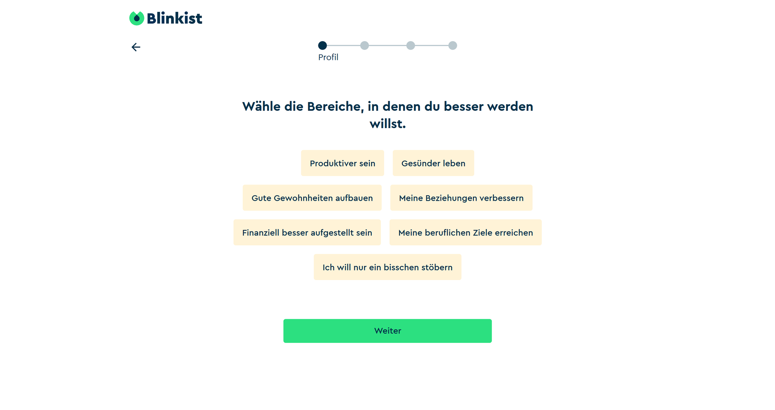 Eine breite Palette von Bereichen öffnet sich bei der Einrichtung (Auszug von blinkist.com)