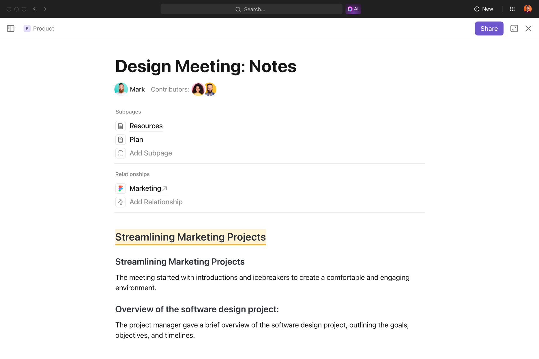 Klasse: Mit den Projektnotizen arbeitest du wie in Notion – perfekt für Meeting Notes, Pläne und verknüpfte Inhalte im Team (Gestellt von ClickUp.com)