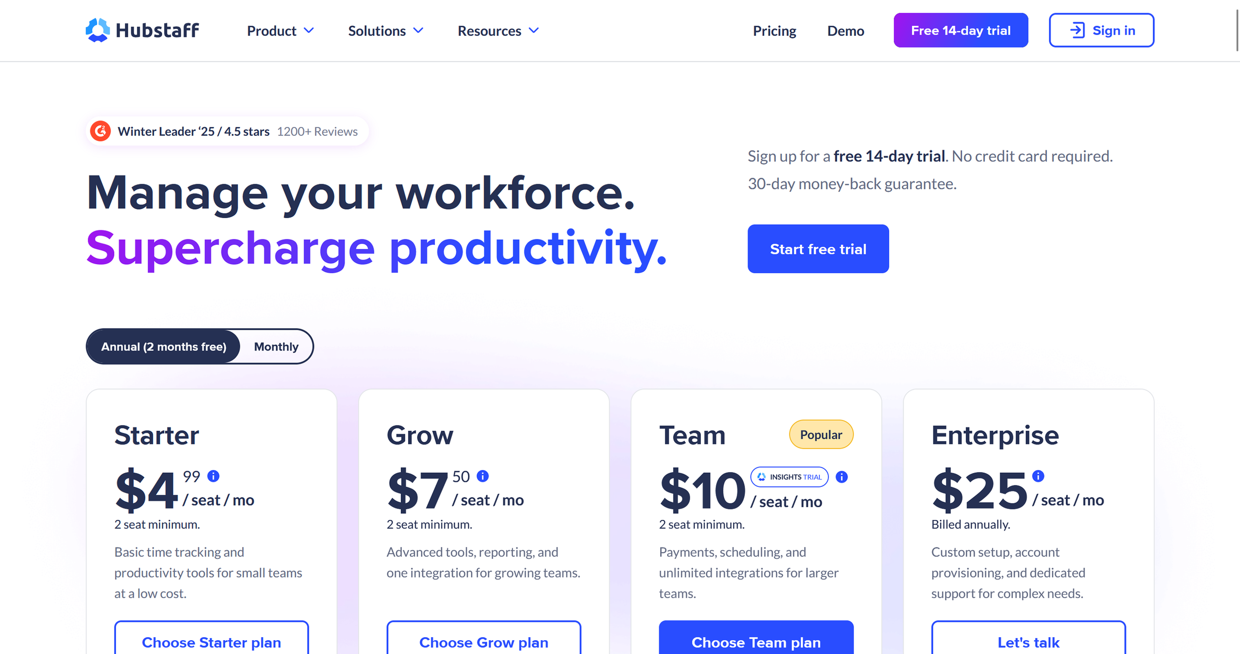 Preisübersicht von Hubstaff: Zeiterfassung für Freelancer ab 4,99 $ monatlich bei jährlicher Abrechnung – mit Tools für Produktivität, Teams und Projektorganisation (Auszug von hubstaff.com)