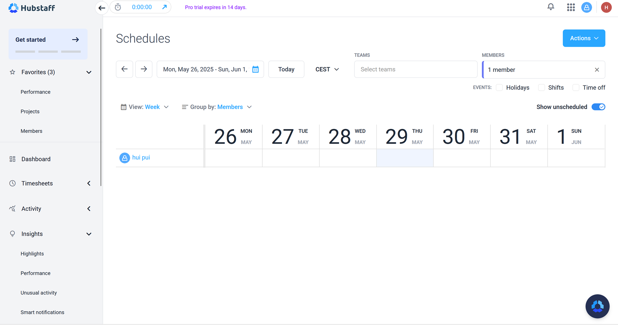 Mit der Kalenderfunktion von Hubstaff planst du Arbeitszeiten, Schichten und Abwesenheiten ganz einfach – ideal für Freelancer mit mehreren Kunden (Auszug aus Tool von hubstaff.com)