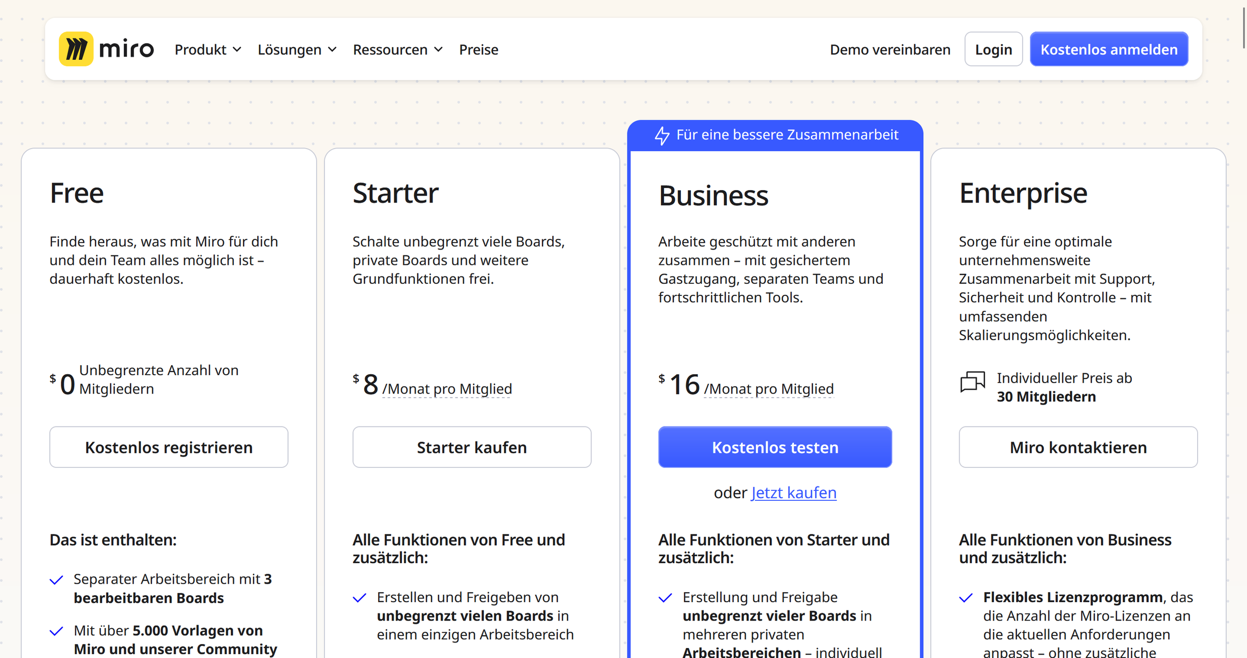 Der Starter-Plan kostet 8 Euro pro Benutzer monatlich bei jährlicher Zahlung und bietet unbegrenzte Boards sowie erweiterte Kollaborations-Features.