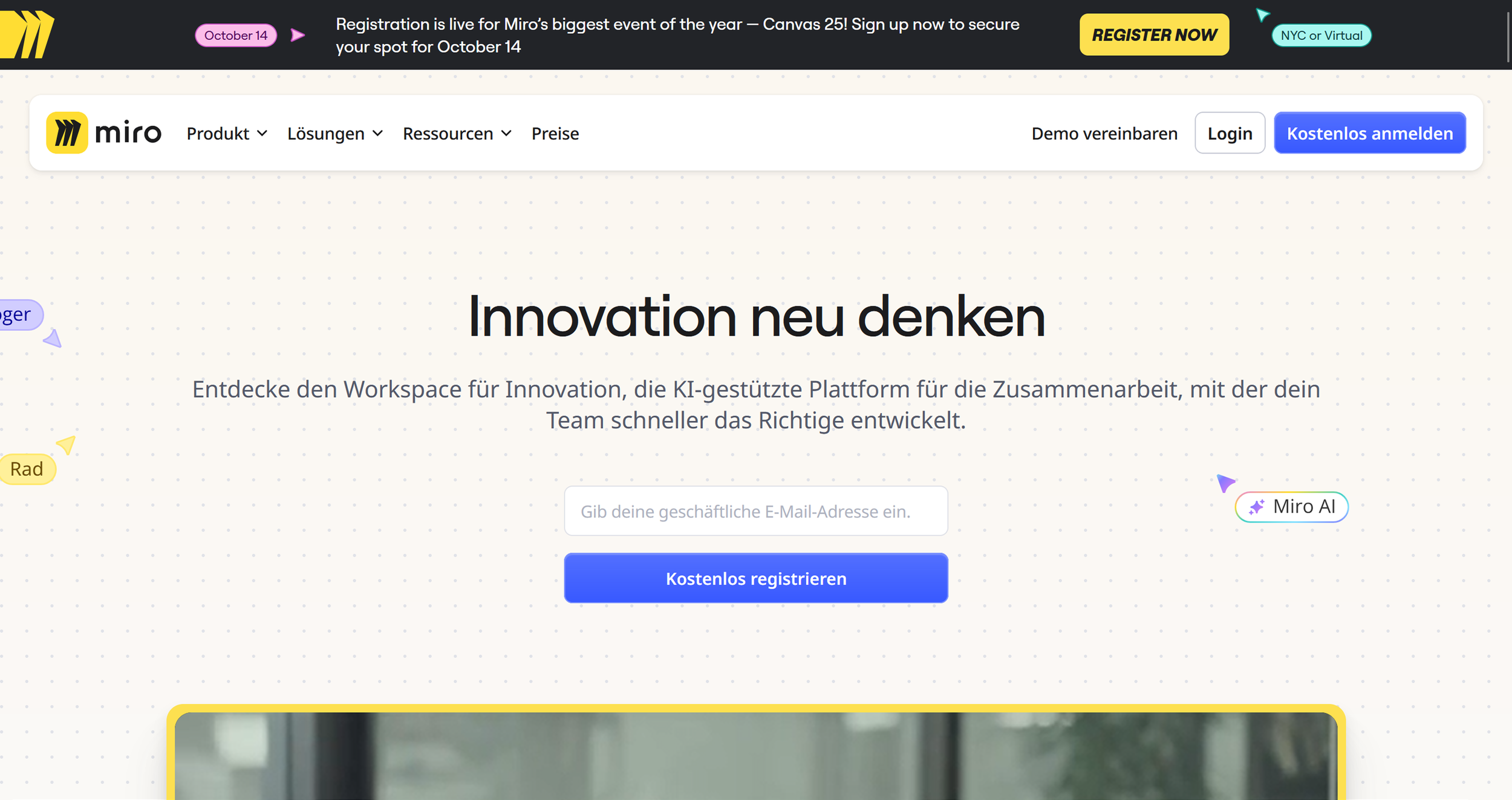 Miro ist ein Workspace, in dem Teams Projekte verwalten, Produkte entwerfen und gemeinsam die Zukunft gestalten. Die Plattform kombiniert digitale Whiteboards mit kollaborativen Funktionen und macht komplexe Ideen visuell erfassbar. Das Tool läuft vollständig im Browser ohne Installation und bietet unendliche Arbeitsflächen für Brainstorming, Projektplanung oder Design-Prozesse.