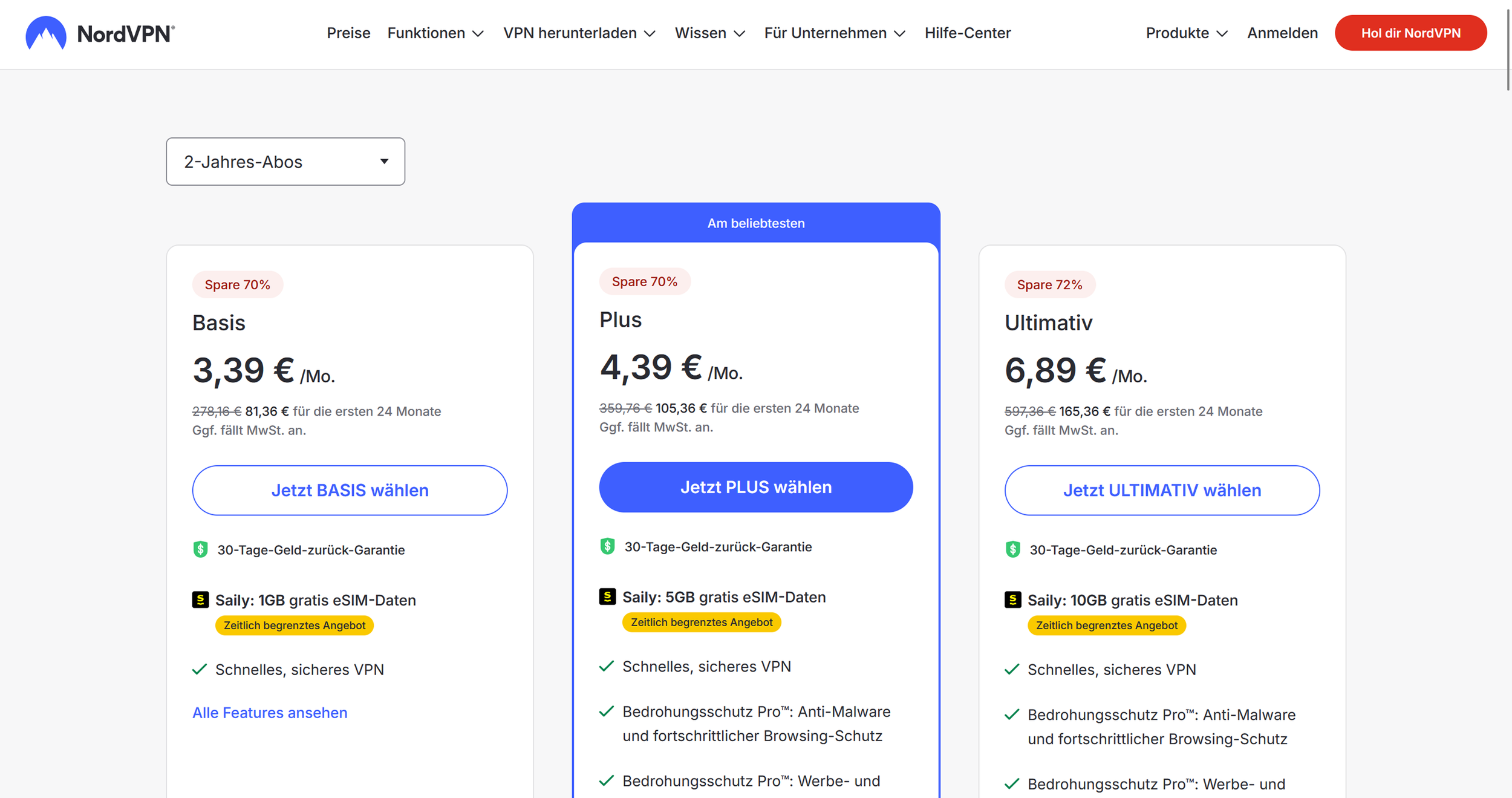 NordVPN bietet dir drei Tarife – mit oftmals hohen Rabatten – bei Abschluss eines 2-Jahres-Abos. Alle Abos beinhalten eine 30-Tage-Geld-zurück-Garantie. Ggf. fällt MwSt. an.