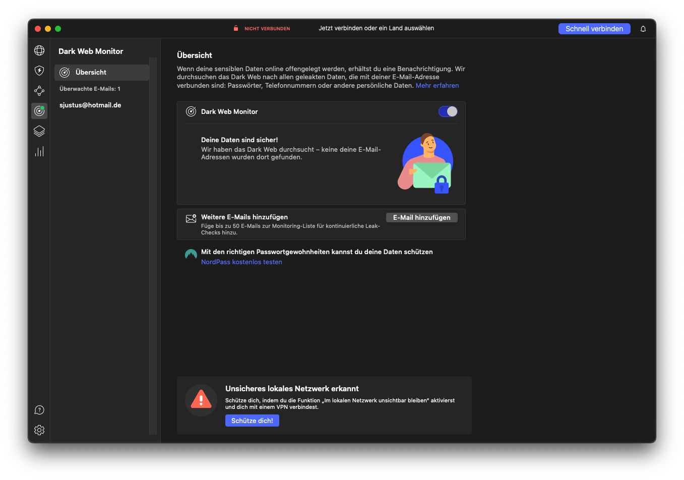 Eine von vielen Funktionen: der Dark Web Monitor prüft Datenlecks (Eigener Auszug vom NordVPN Desktop-Tool)