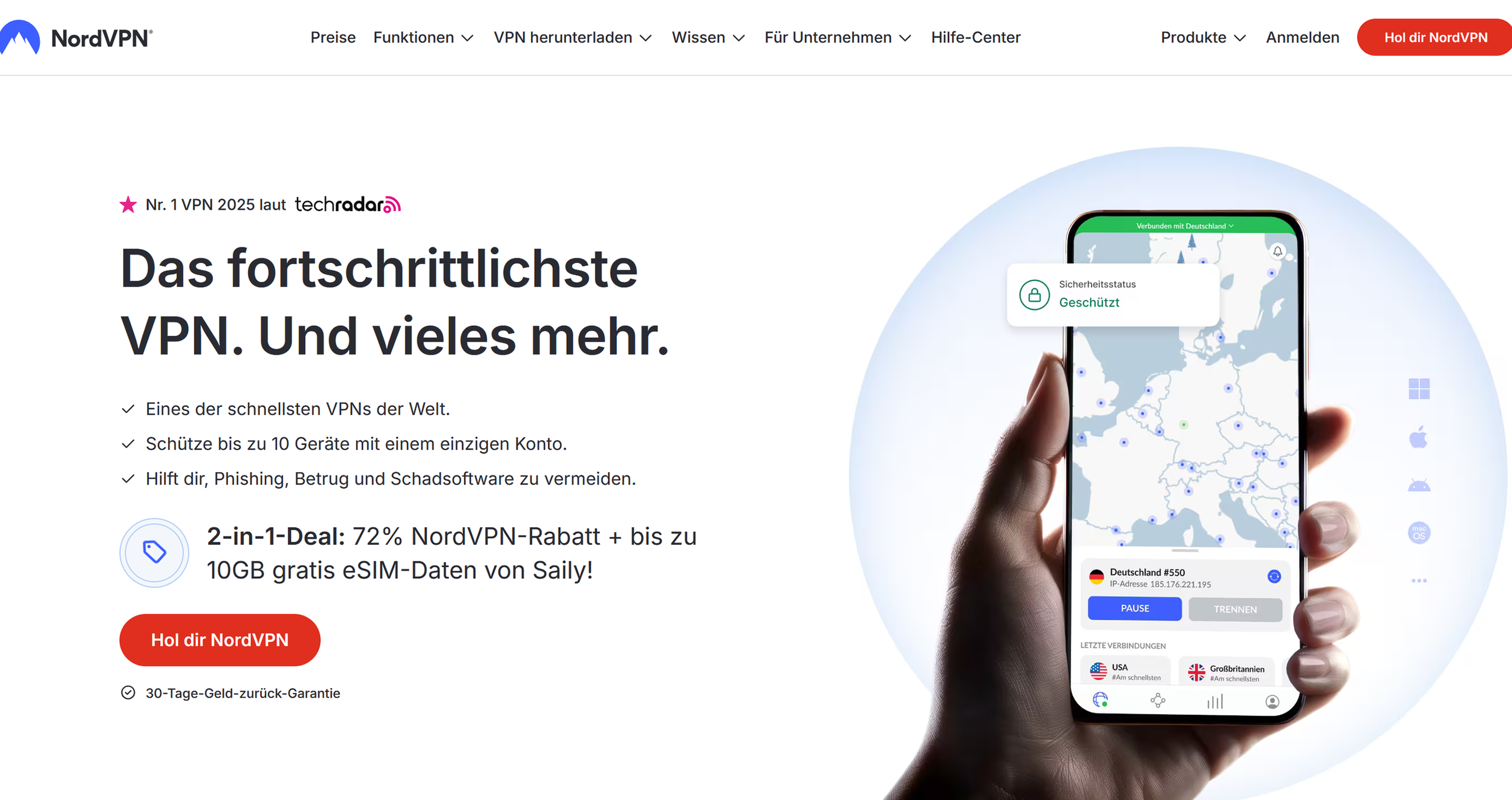 NordVPN ist ein mehrfach ausgezeichneter VPN-Dienst, der deine Internetverbindung verschlüsselt und deine IP-Adresse verbirgt. Das schützt dich vor Tracking, Überwachung und Hackerangriffen – egal ob im Coworking-Space, Hotel oder im Café mit öffentlichem WLAN. Mit über 5.000 Servern weltweit und zahlreichen Zusatzfunktionen ist NordVPN nicht nur sicher, sondern auch blitzschnell und einfach zu bedienen.