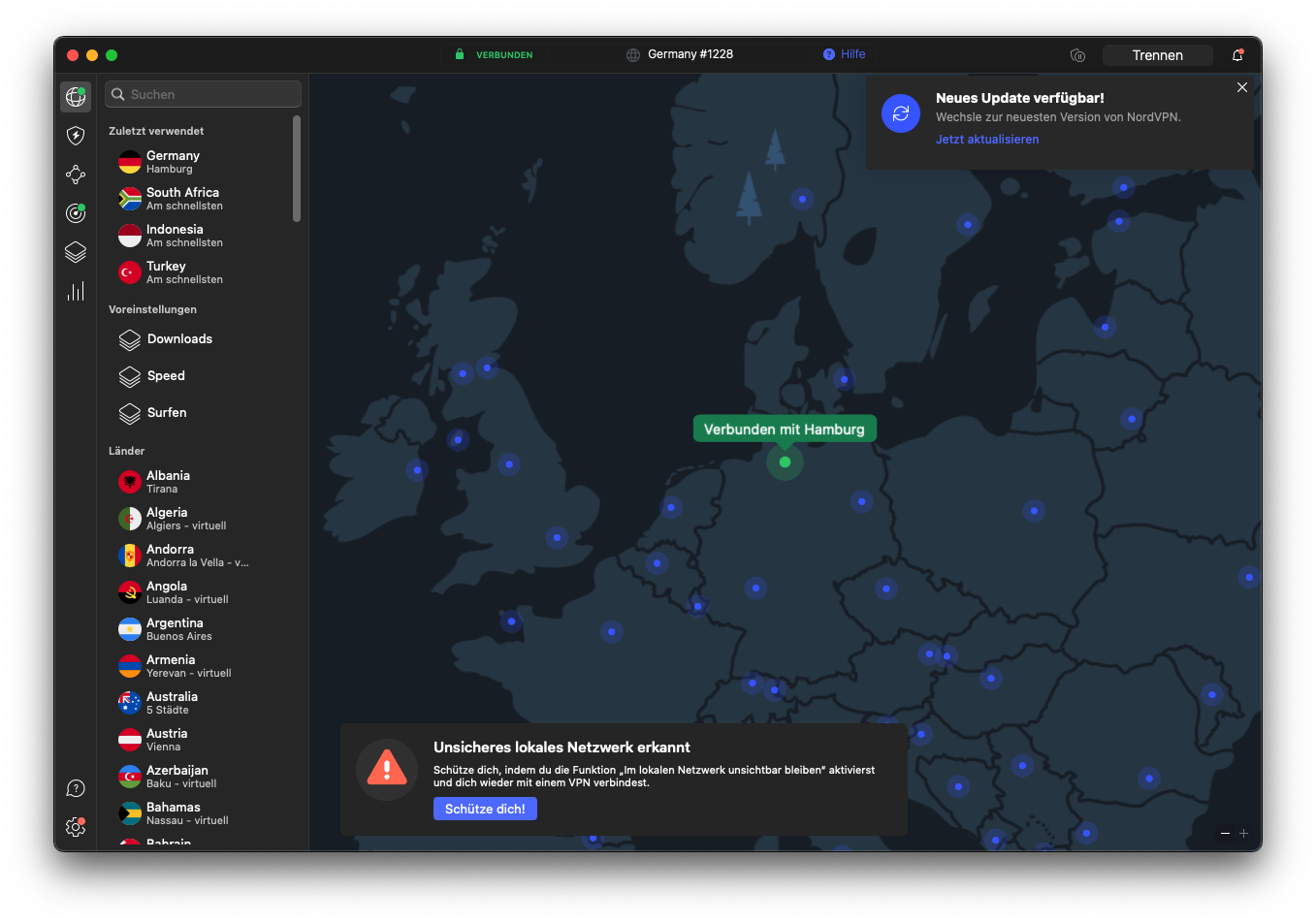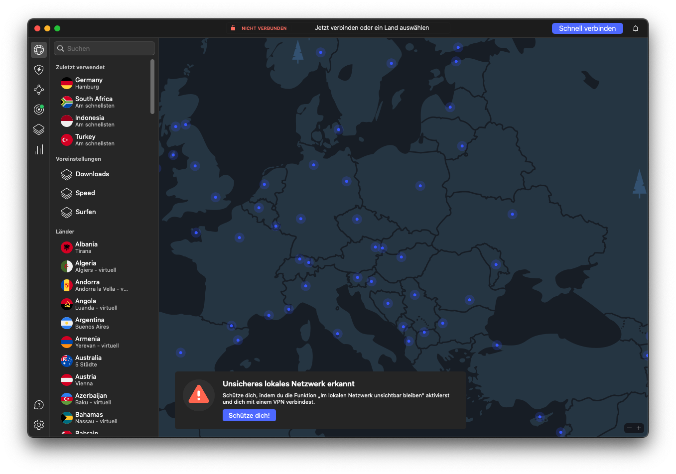 Übersichtliche Benutzeroberfläche mit Kartenansicht auf Mac-Betriebssystem im Darkmode (Eigener Auszug vom NordVPN Desktop-Tool)