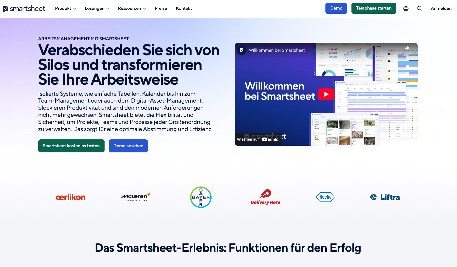 Die Startseite von Smartsheet mit Einblicken in Projektmanagement-Funktionen und flexible Workflows (Auszug von smartsheet.com)