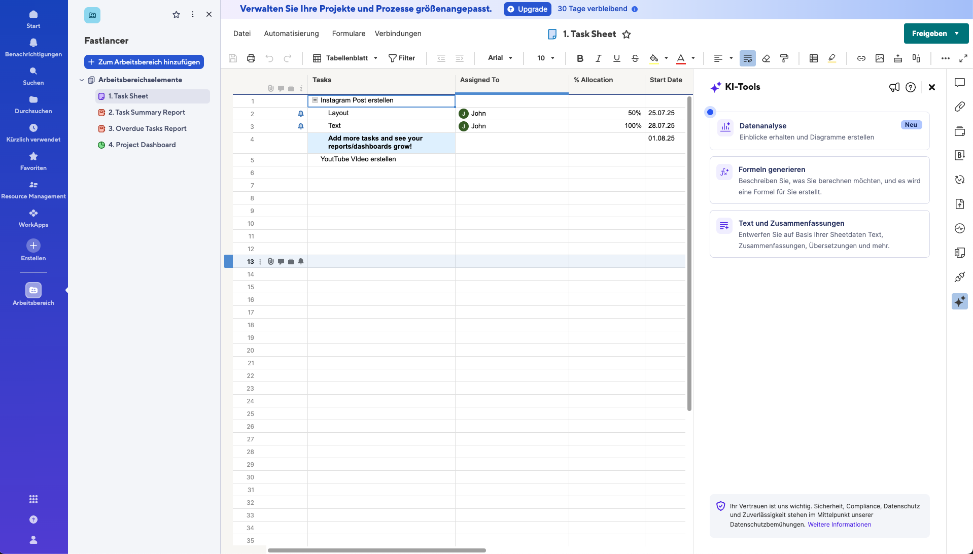 Übersicht der Aufgabenverwaltung in Smartsheet mit Zuweisungen und Startdaten + KI Features (Auszug aus Tool von smartsheet.com)