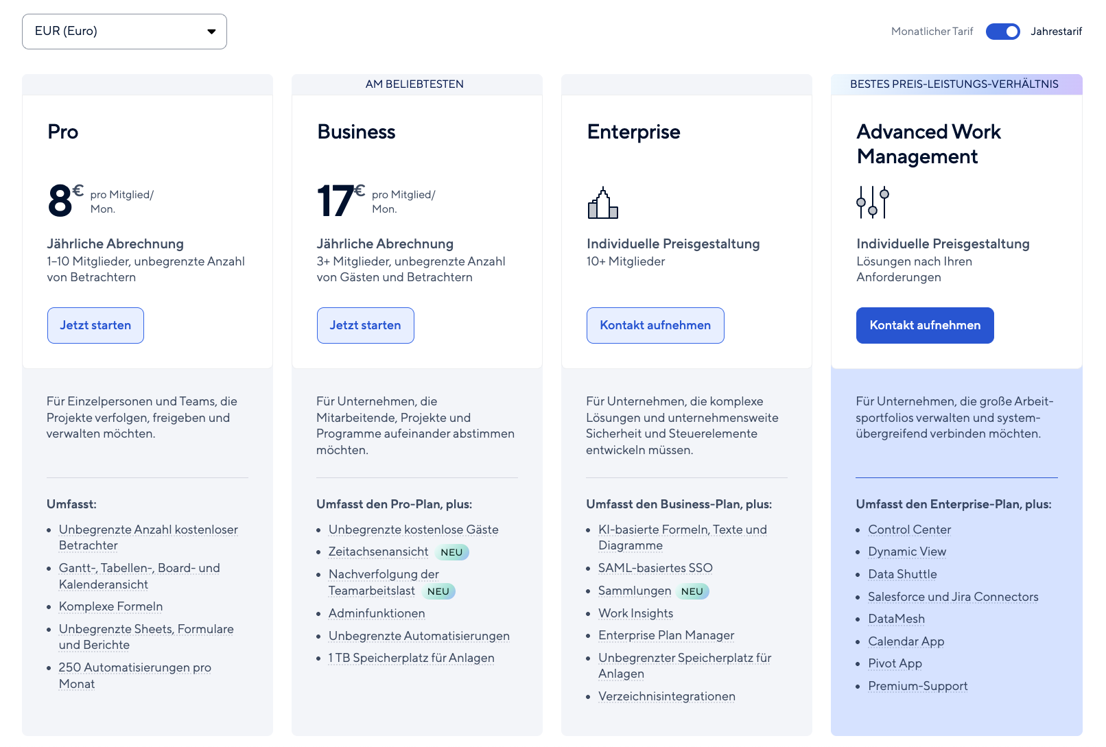 Business-Plan: ca. 17 € pro Nutzer/Monat, mit erweiterten Berichten, Dashboards und mehr Automatisierung