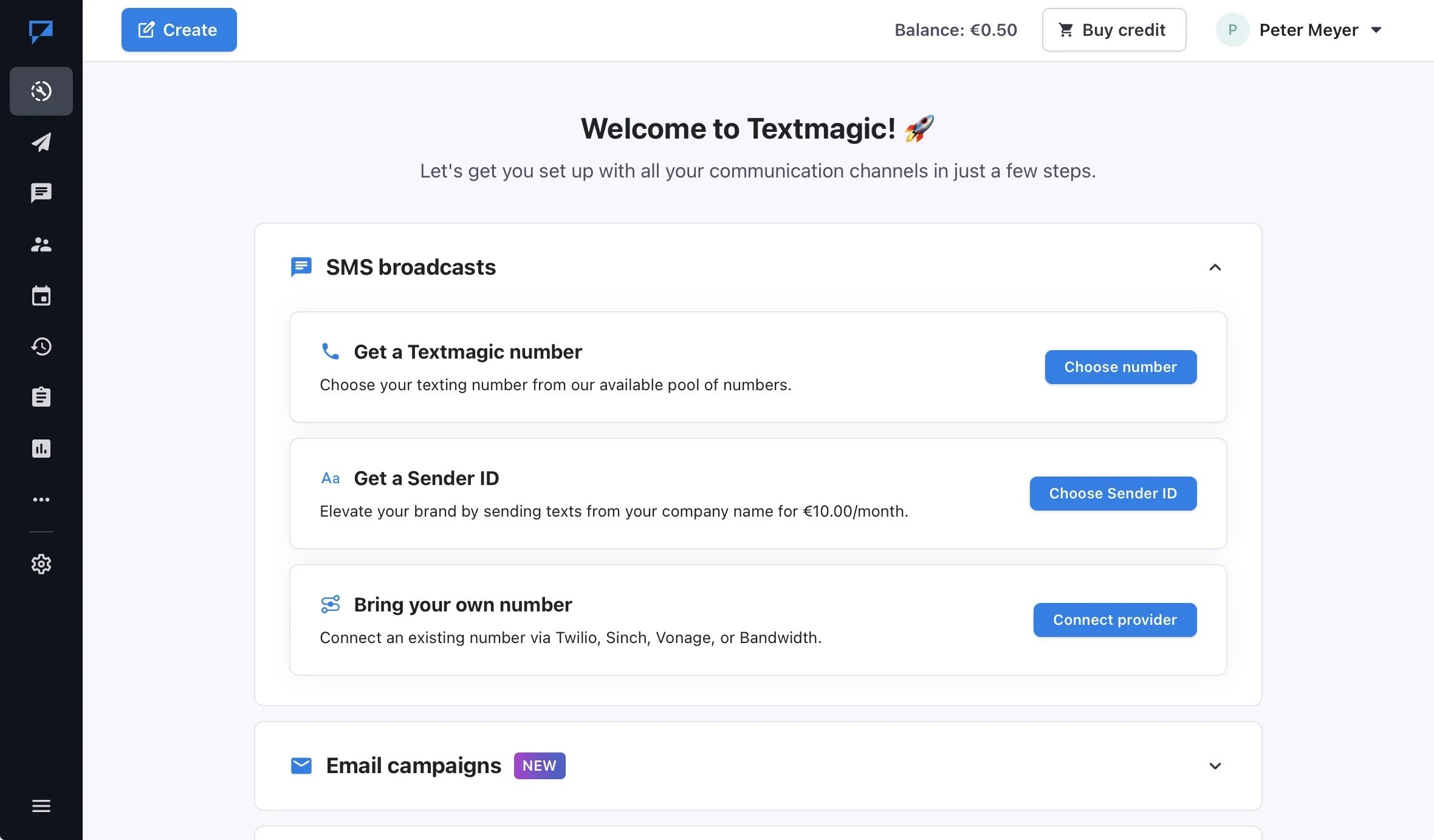 TextMagic Dashboard: SMS-Setup mit Nummernwahl und Sender ID-Optionen