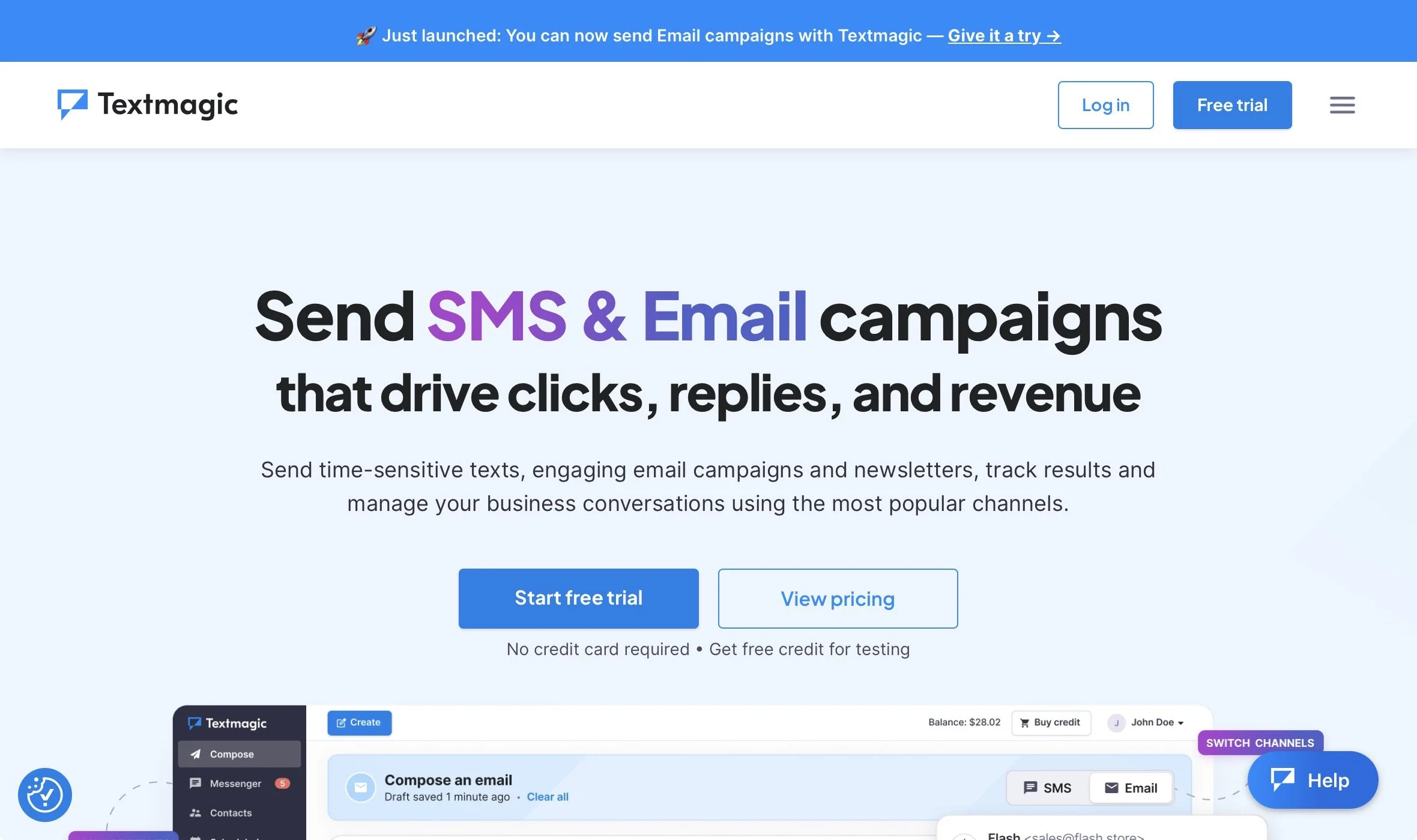 Textmagic Startseite SMS & E-Mail-Kampagnen mit kostenloser Testversion (Auszug von textmagic.com)