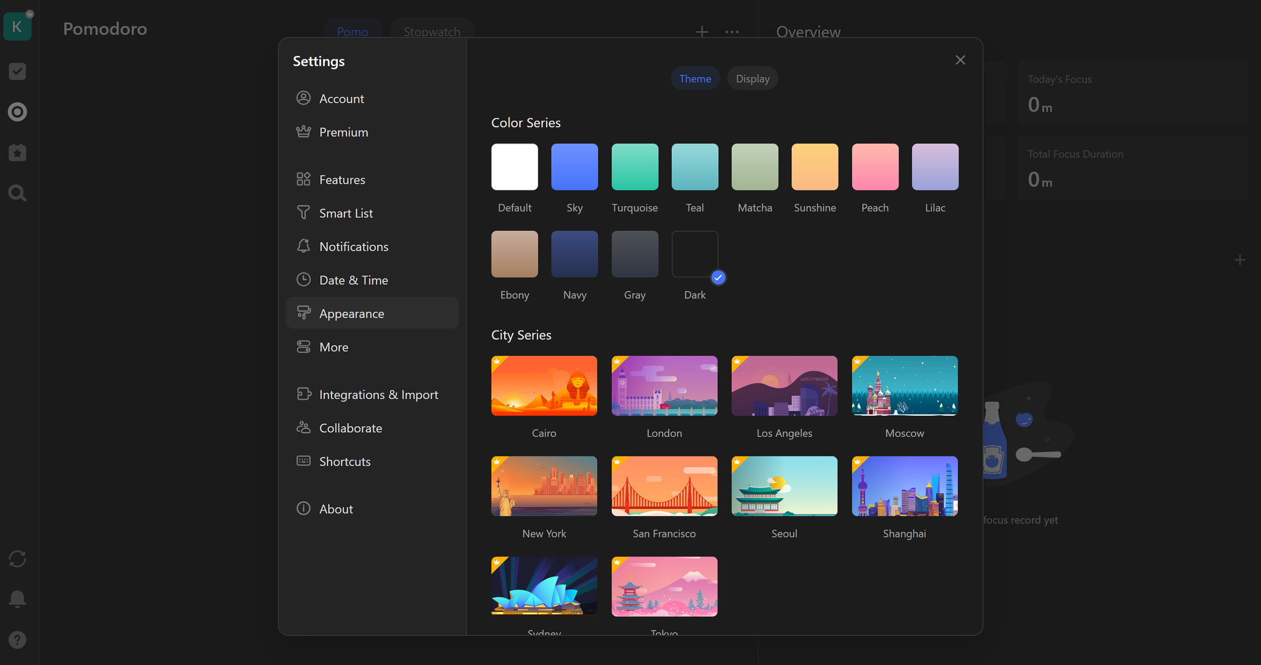 Zahlreiche Möglichkeiten das Aussehen der Oberfläche anzupassen mittels Themes, z.B. auch mit einem Dark-Mode (Eigener Auszug aus TickTick)