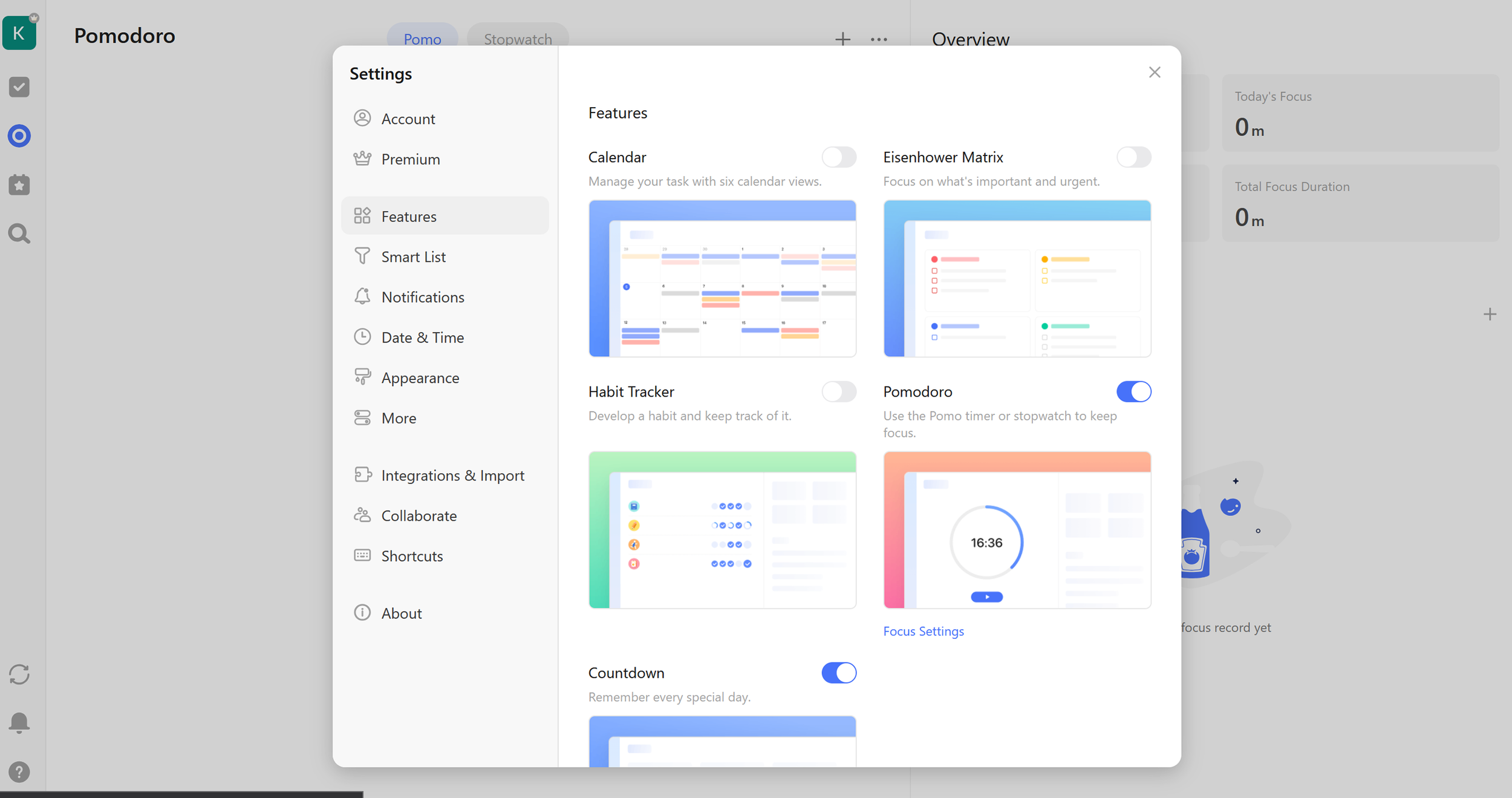 Integrierter Pomodoro-Timer und Stop-Uhr für fokussiertes Arbeiten (Eigener Auszug aus TickTick)